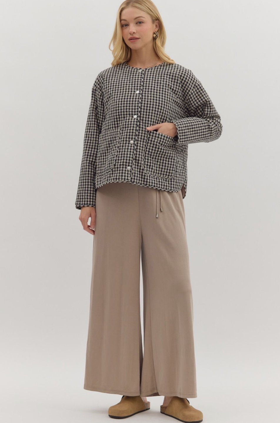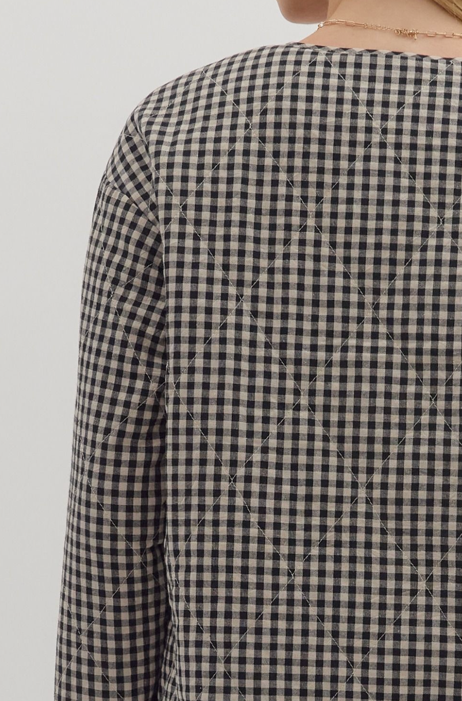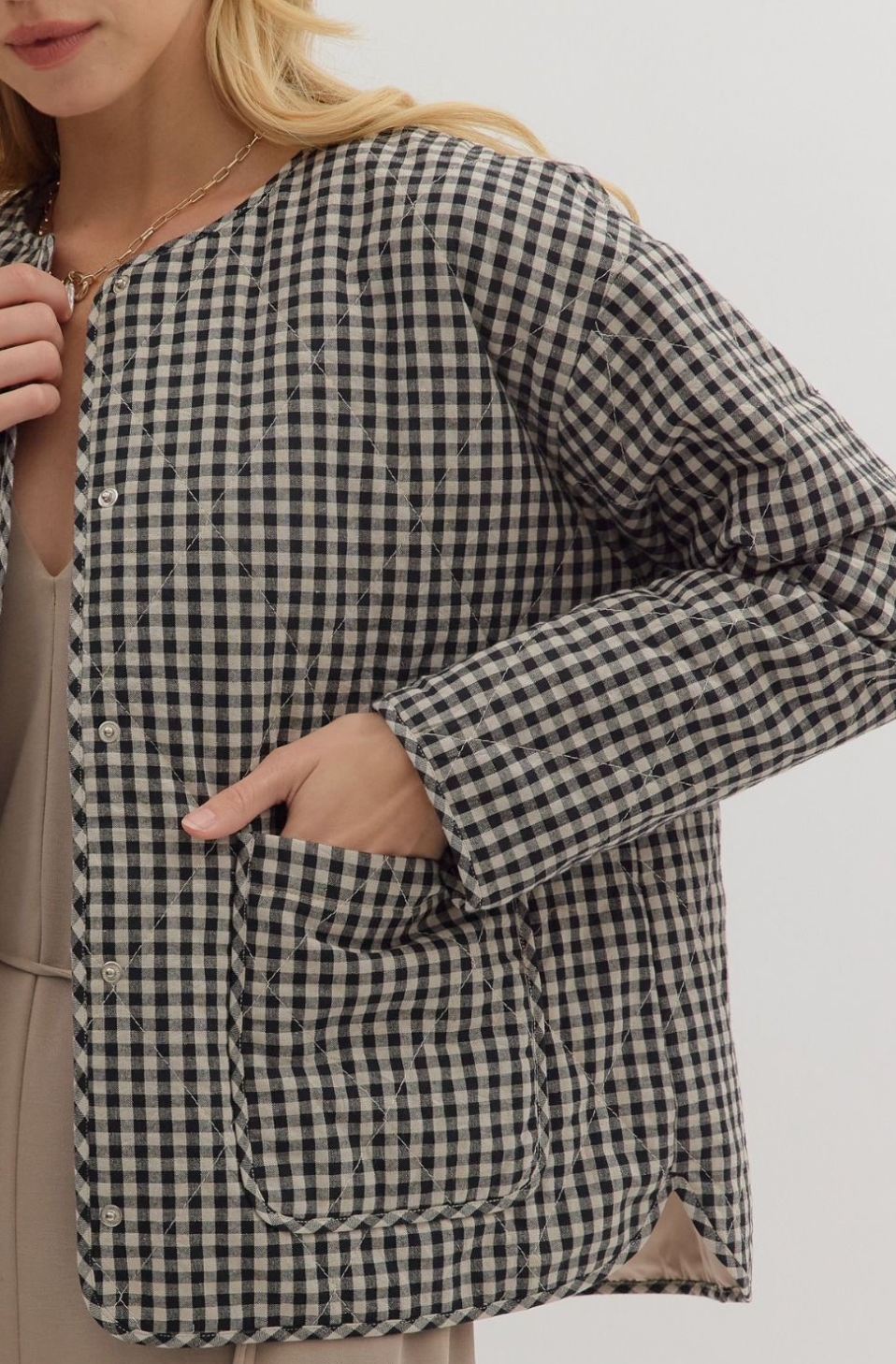 Cozy meets classic in the Alpine Jacket. This black and white quilted button-up features a timeless gingham pattern, soft padded construction, and two front patch pockets for added charm and function. Designed with a collarless neckline and snap closures, it's the perfect lightweight layer for transitional seasons. Pair it with denim, lounge pants, or over a simple dress for an effortless, laid-back look.