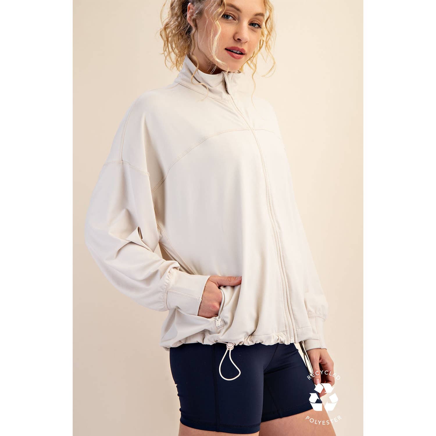 An oversized active jacket made from recycled butter-soft, lightweight fabric. Featuring secure side pockets, cinch the cords at the hem to adjust the shape, and thumbhole details, it's perfect for comfortable, stylish movement. Features: - Recycled butter soft and lightweight fabric - 4-way stretch - Relaxed fit / Oversized - Full zipper closure - Mock neck - Long sleeve - Zippered secure side pocket - Cinch the cords at the hem - Thumbhole detail Model is 5'8" and wearing size Small.