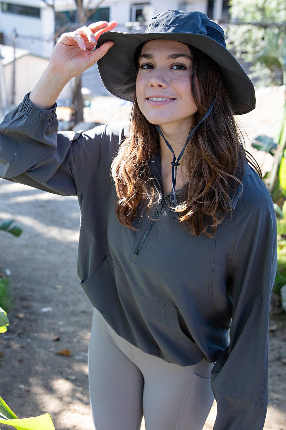 This active jacket is made from lightweight and cooling fabric, perfect for hiking and adventures year-round. Designed for active lifestyles, it offers breathable comfort beyond the summer season. Features: - Lightweight and cooling fabric - Relaxed fit - Slightly cropped length - Pullover jacket - Quarter zipper closure - Mock neck - Cinched sleeve / Long sleeve - Cinchable hem with elastic string - Kangaroo pocket