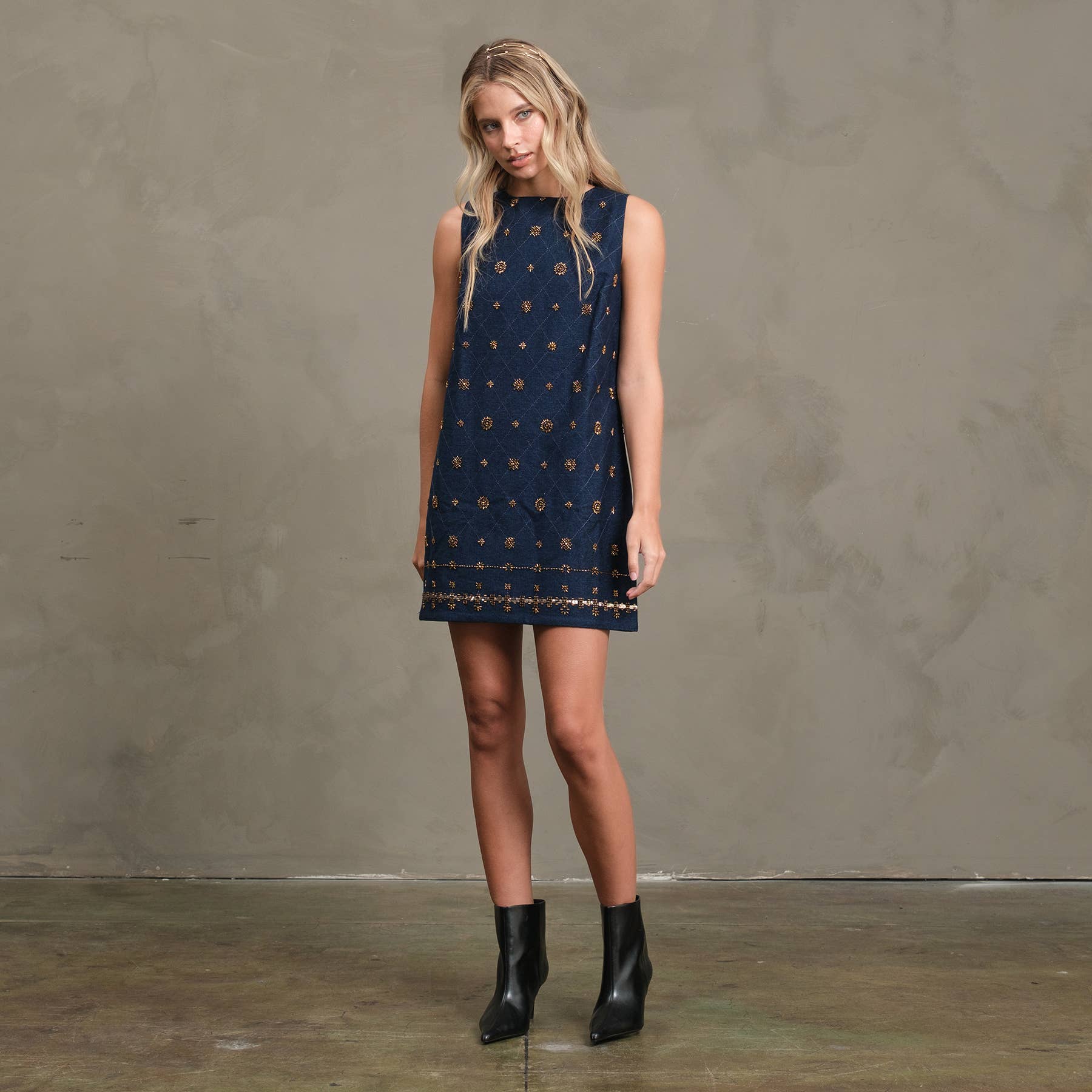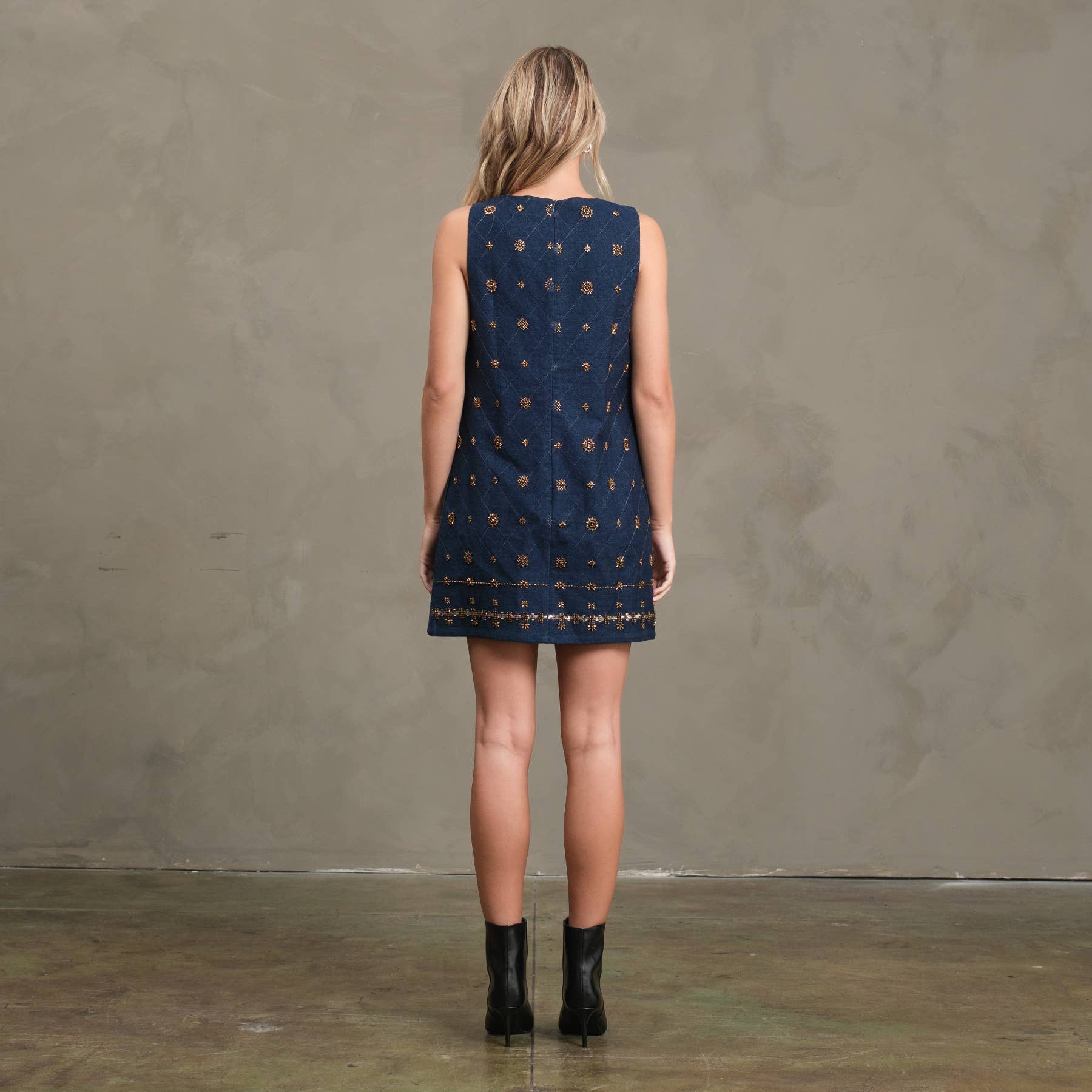 This charming sleeveless shift dress combines a timeless shape with sparkling handcrafted details. Crafted from quilted denim shimmering with gold accents, it features a round neckline and a charming embroidered hem for a playful touch. Fully lined for comfort and a back zipper for easy wear. Model wears size S, standing 5’8” tall. Outer fabric is 100% cotton, with a polyester lining to keep you comfy all day long.