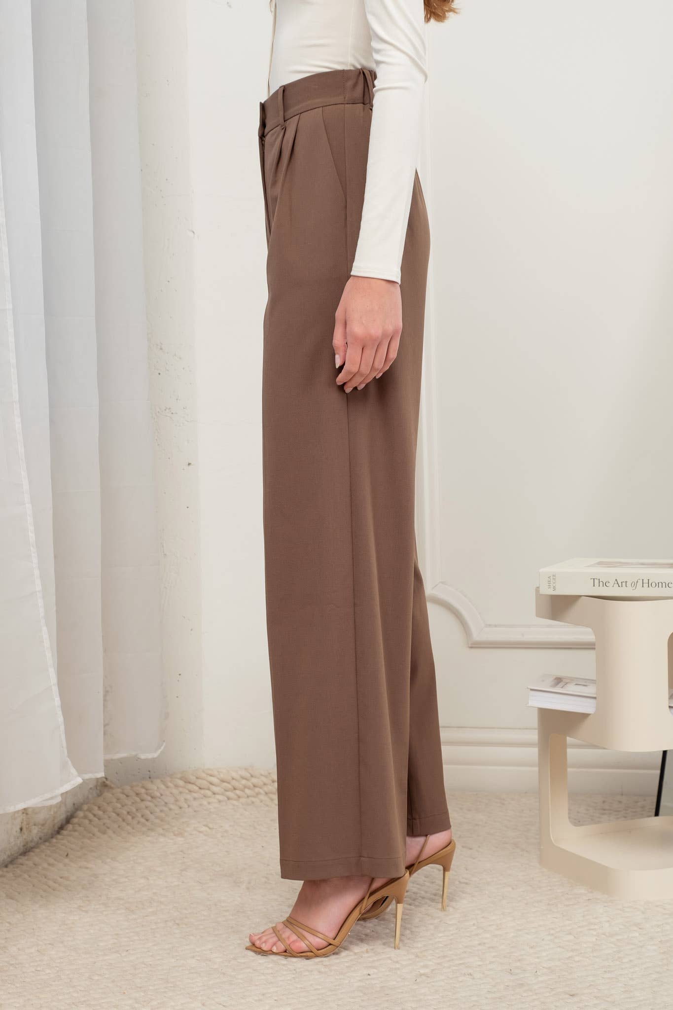 Crafted in a solid brown hue, these high-waist pants feature pleats, a button and zipper closure, belt loops, and a wide-leg design that extends to full length for a refined and sophisticated appearance.