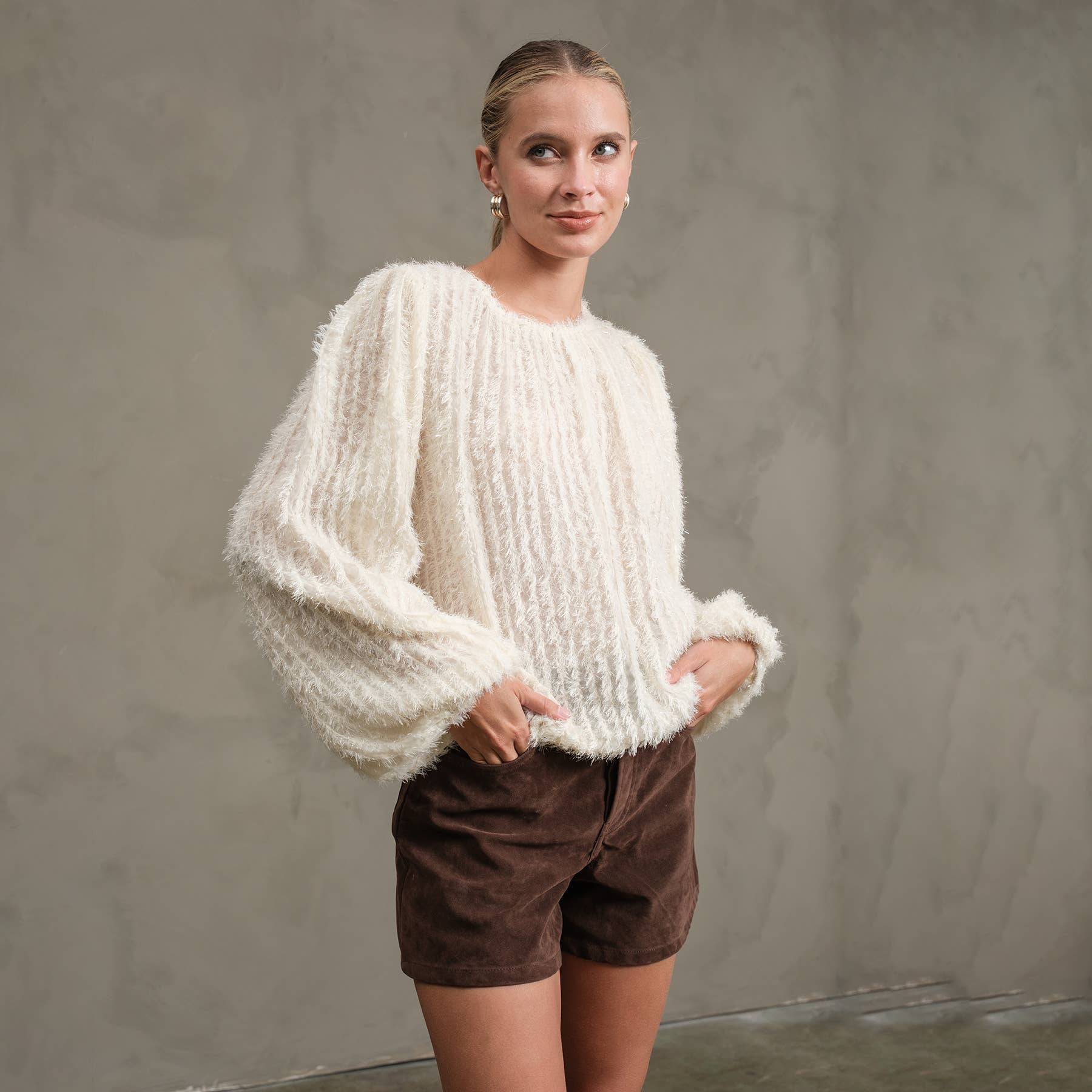 Celebrate the season in style with the Shimmer Sweater, offered in timeless black and dreamy Ivory. Its soft, plush fabric sparkles subtly, perfect for festive parties, winter nights, or cozy hangouts by the fire. Romantic balloon sleeves and a relaxed fit keep things comfy and cute all day long. Dress it up with a chic skirt or keep it casual with jeans—this sweater adds a warm, elegant glow to every holiday moment. Made from 100% Polyester. Model wears size S.