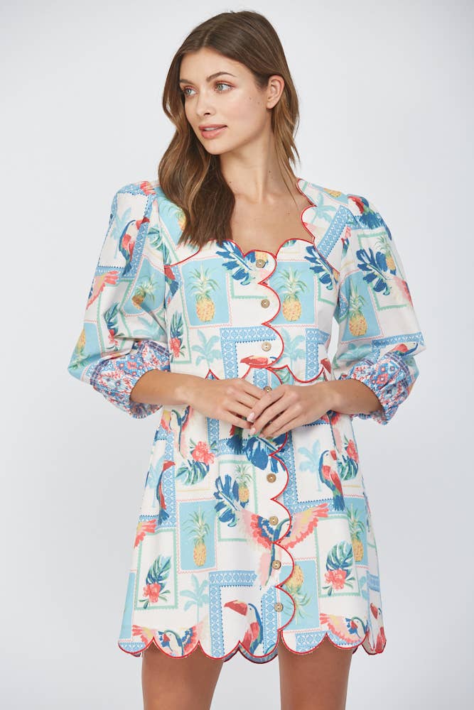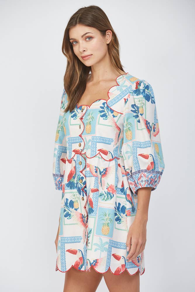 The Sunstone Mini Dress embodies the relaxed elegance of a sun-drenched beachside villa, featuring a vibrant tropical parrot print on a breathable linen blend fabric. Expertly crafted with scallop edge detailing, this dress offers a flattering silhouette and lightweight comfort, perfect for warm-weather getaways or chic daytime events. Its refined yet playful design channels a Mediterranean vibe, making it an essential piece for those who value both style and ease in their summer wardrobe.