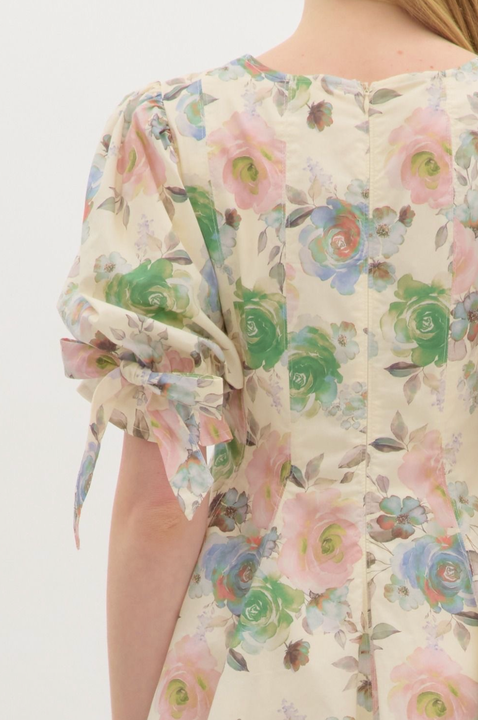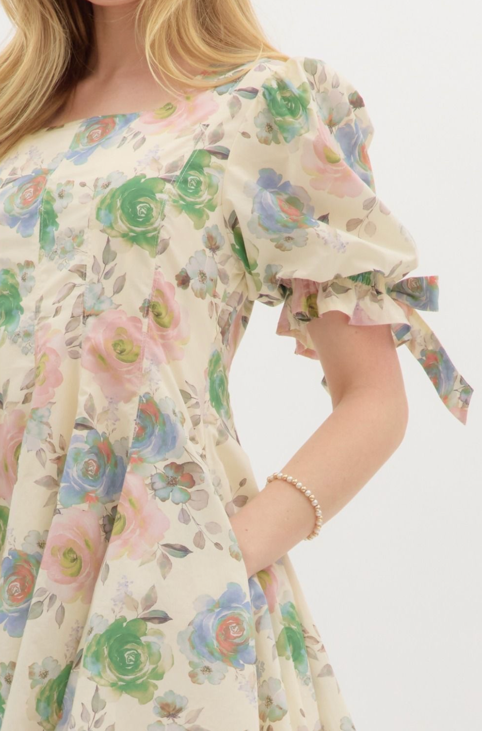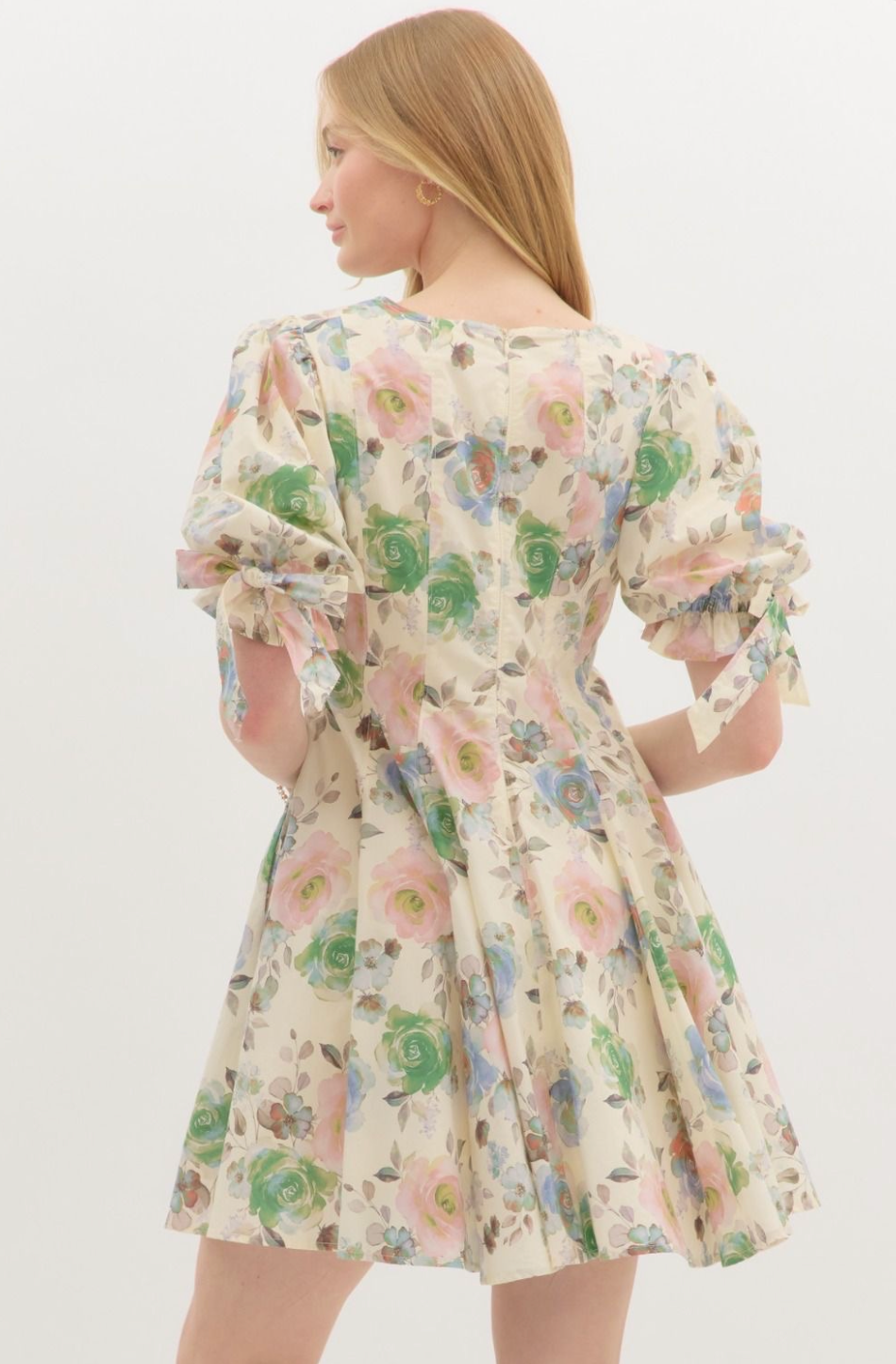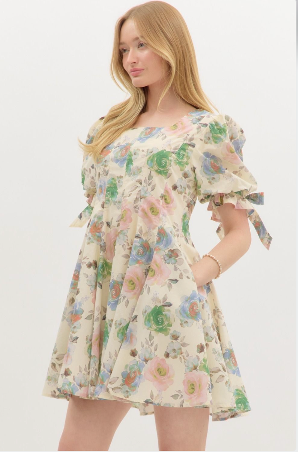 This refined mini dress showcases subtle floral designs paired with chic puff sleeves, creating a polished and elegant look.