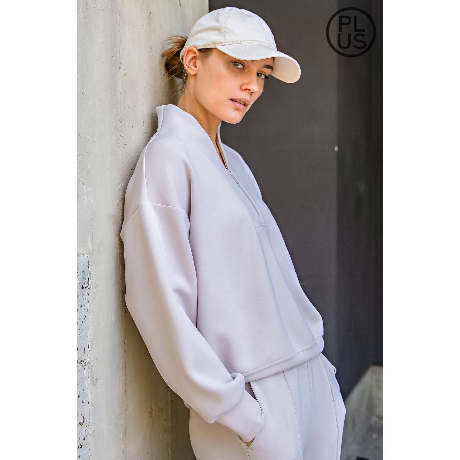 Crafted from a sumptuous, silky-smooth fabric, this jacket is exceptionally soft and lightweight for a luxurious feel. The oversized fit exudes a laid-back vibe, complemented by the half zipper closure and bubbled sleeves, creating a fashion-forward look. With a convenient front pocket and dropped shoulder design, this jacket seamlessly combines comfort and trendiness. Features: - Plus/Curvy Size.