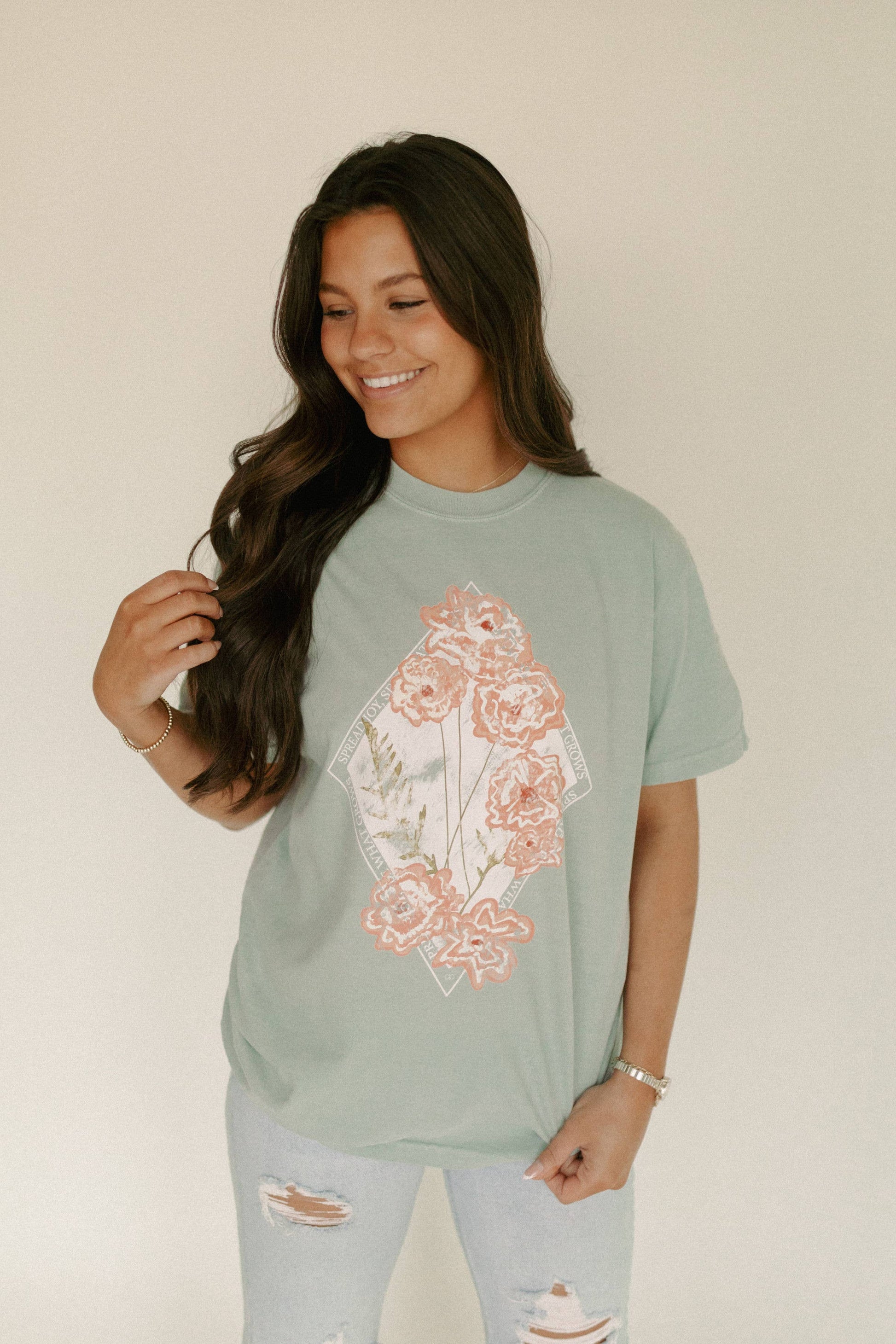 Add a touch of joy to your wardrobe with our Spread Joy, See What Grows' tee from The Bloom Collection. In a serene sage green color, adorned with peachy flowers, this tee is surely blooming!