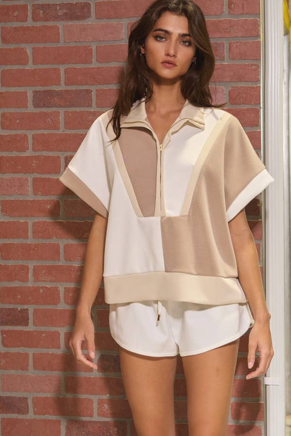 The Painted Hills Quarter Zip is a refined short-sleeve pullover designed for both comfort and style. Crafted from exceptionally soft scuba fabric, it offers a smooth, luxurious feel against the skin. The funnel neck with a half-zip closure allows for adjustable ventilation and a polished look. Featuring a tasteful contrast color-block design, this piece adds subtle visual interest while maintaining a sophisticated aesthetic. The banded hemline ensures a flattering fit, making it an ideal choice for layering or wearing on its own during transitional seasons.