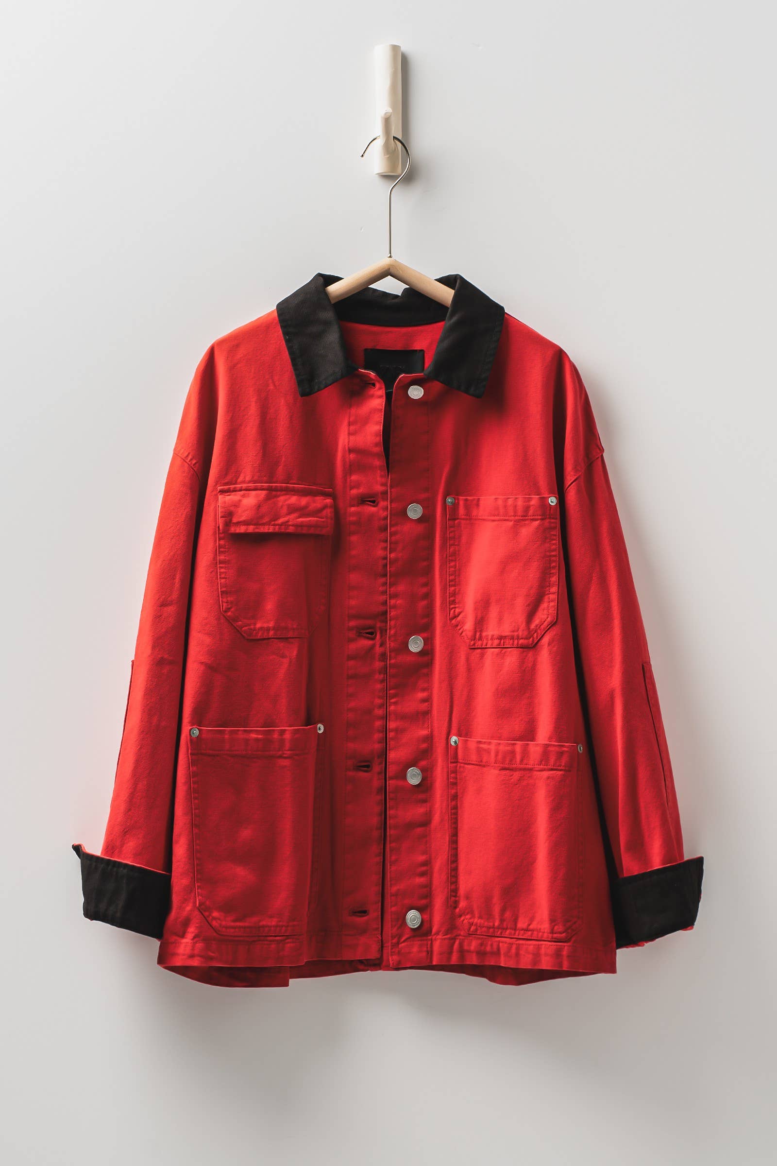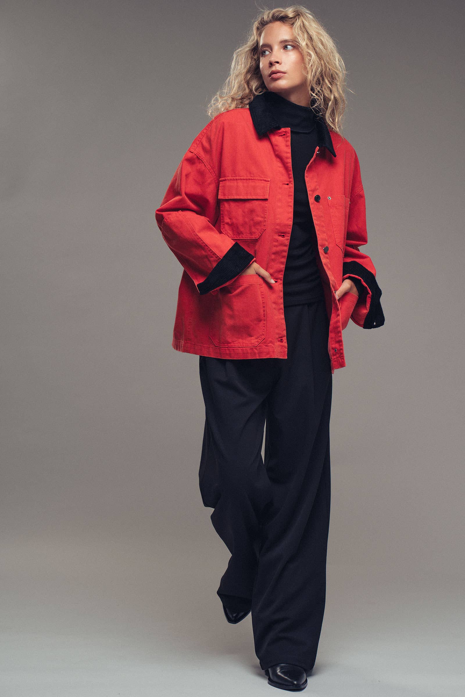 This workwear-inspired jacket features a relaxed, slightly oversized fit with a distinctive contrasting collar and sleeve cuffs for a modern, stylish accent. Crafted from 100% cotton inside and out, it offers breathable comfort and versatile layering for spring 2025 clothing and beyond. Multiple front pockets and sturdy snap buttons add utility and classic appeal.