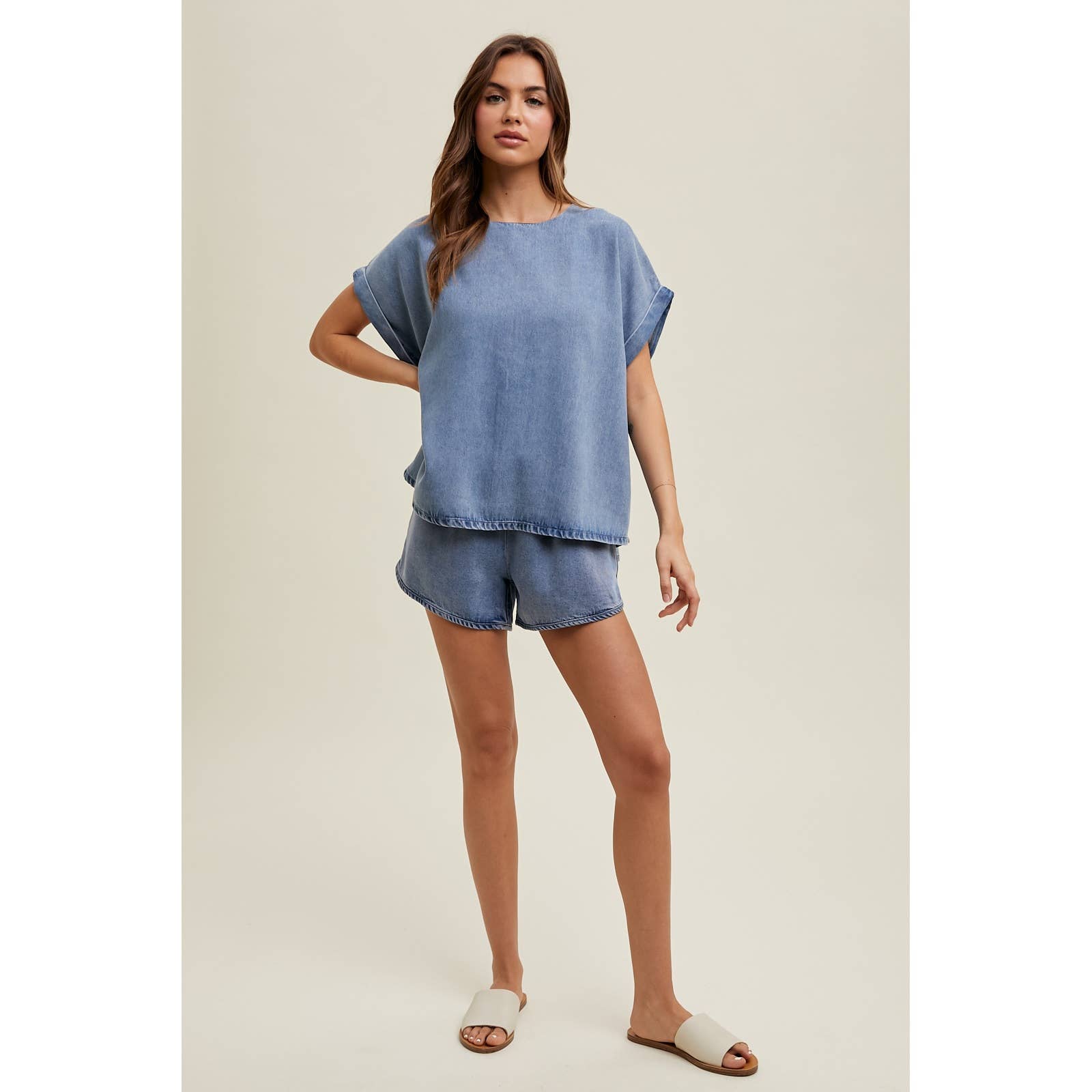 These washed tencel denim shorts feature an elastic waistband for comfort and practical side pockets. The inseam measures 3 1/2 inches. The model is shown wearing a size Small.